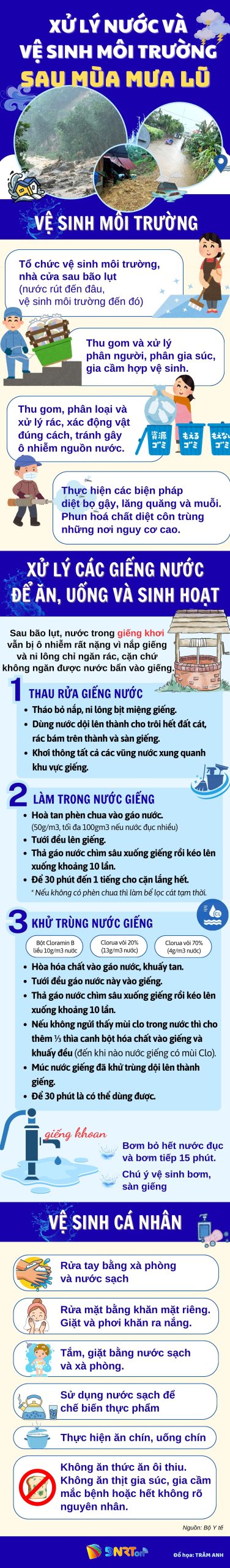 Mưa lũ khiến nguồn nước và môi trường bị ô nhiễm nghiêm trọng, tiềm ẩn nguy cơ phát sinh dịch bệnh. Việc xử lý nước và vệ sinh môi trường cần thực hiện khẩn trương theo nguyên tắc “nước rút đến đâu, làm vệ sinh đến đó”.